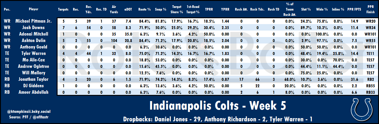 Some modest lines in this one from the main players, as Michael Pittman Jr. (5-39-1) and Tyler Warren (4-44-1) both caught touchdown passes. Josh Downs (6-54) looked really good here, too, as the leader in targets in his typical slot-only role. With the game so out of hand, it’s understandable that volume was curbed.