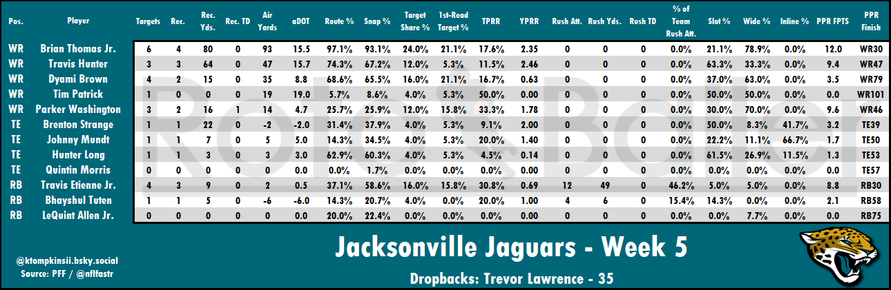Nothing’s really changed with the Jaguars’ run game, Travis Etienne Jr. (12-49 rushing; 3-9 receiving) still pulls a sizable amount of volume, Bhayshul Tuten (4-6 rushing; 1-5 receiving) is a bench stash, and LeQuint Allen takes too many routes from both that limits some of the upside from the two other backs. Somehow, the Jaguars are putting it all together with an offense that isn’t a top-end one but has a sneaky defense that’s sixth in EPA allowed per play.