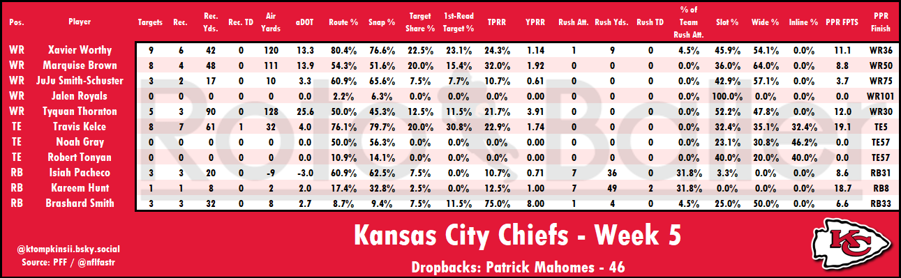 Pacheco’s role was much stronger in Week 5 than in recent weeks, as he saw a season-high 62 percent of snaps and 60 percent of routes. Something to note, but not to put much action on, as it seems to vary by game script more often than not for the Chiefs.