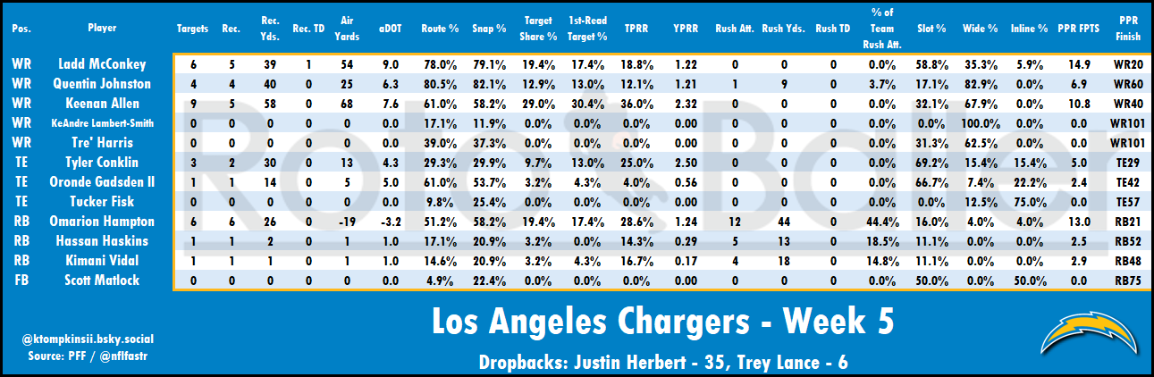 Some passing-game struggles here in Week 5 for the Chargers as the team was much more balanced than in any other game this season, with just 29 pass attempts for Justin Herbert, and he then gave way to Trey Lance for four more pass attempts.