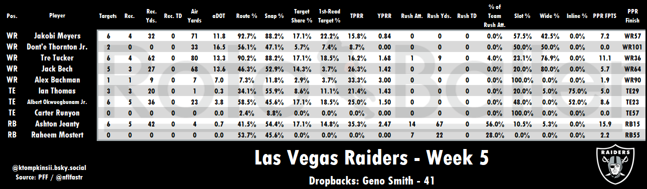 Four players each had six targets in a very spread-out target tree. Jakobi Meyers (4-32) hung around, as did Tre Tucker (4-63). Albert Okwuegbunam Jr. (5-36) ran the most routes for the Raiders’ tight ends, with backup Michael Mayer ALSO out.