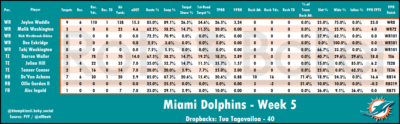 Well, we got outcome two and outcome four hitting in Week 5. All three of Waddle (6-110-1), Achane (10-16 rushing; 6-30-1 receiving), and Waller (5-78-1) combined for 62 percent of the targets. Waller continues his amazing run as he had a 14.0-yard aDOT, which looks like prime Waller from his days with the Raiders.