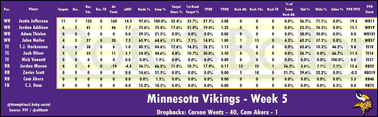 Wentz threw one touchdown pass to Jordan Addison (5-41-1), who missed the entire first quarter for missing the team’s walkthrough. Justin Jefferson (7-123, team-leading 11 targets) at last count: still really good! T.J. Hockenson (7-38) was just fine, though, as he carried some volume but at a very low 1.0-yard aDOT. Josh Oliver (2-35-1) caught the other touchdown, but from Cam Akers (1-for-1 passing, 32 yds., TD) on his only offensive snap!