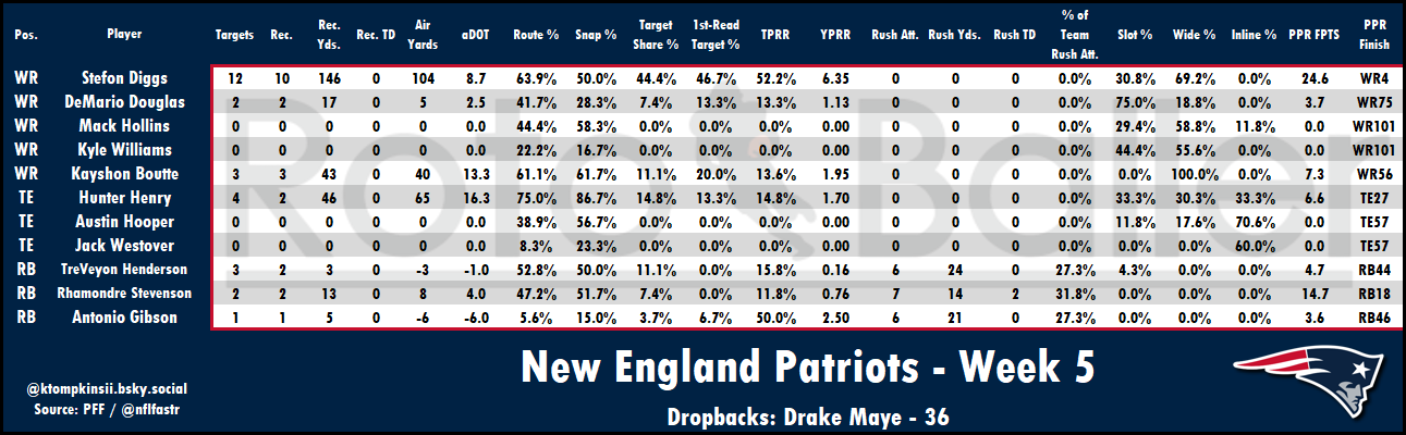 Diggs (10-146, team-leading 12 targets) has been the unquestioned alpha in this passing game with 44 percent of the team’s targets to piggyback off of last week’s 6-101 against the Panthers. He’s been dominant in an offense that has badly needed a consistent target-earning presence. Diggs feels good enough to start again in fantasy, but Hunter Henry (2-46, four targets) didn’t come along for the ride despite 30 pass attempts and 273 yards from Drake Maye.