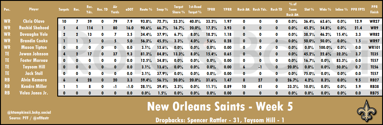 Chris Olave (7-59, team-leading 10 targets) gets there almost every week with his fourth week of 10+ targets, but no more than 59 receiving yards in each of his five contests. Rashid Shaheed (4-114-1) made his week with an 87-yard touchdown pass from Spencer Rattler. Otherwise, Shaheed was 3-27 on four targets. Not super great, but it's the Saints.