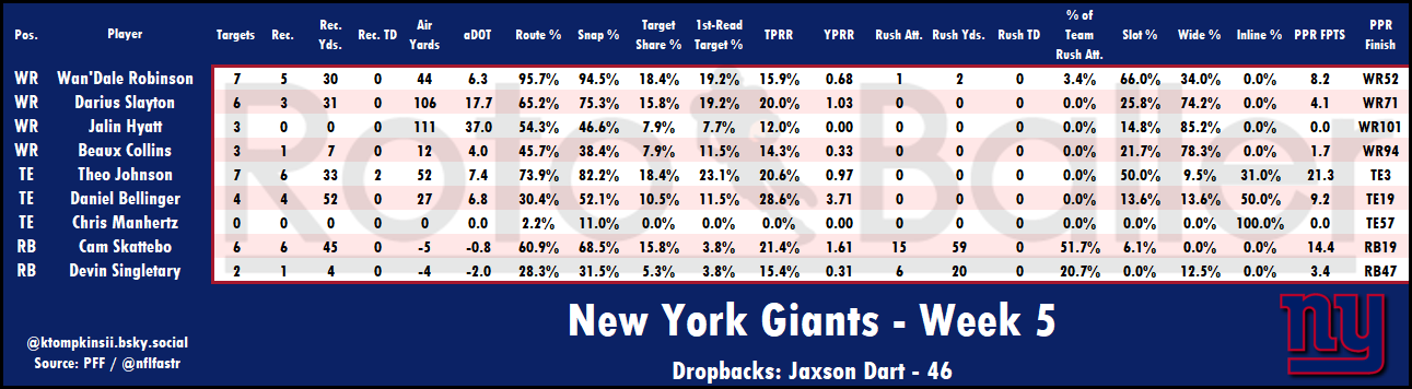 New York was at least smart in continuing to build the offensive plane around Cam Skattebo. Skattebo had a very strong 69 percent of snaps and 61 percent of routes. Devin Singletary has his pass-protection role, but still carried some opportunity with six carries and two targets.