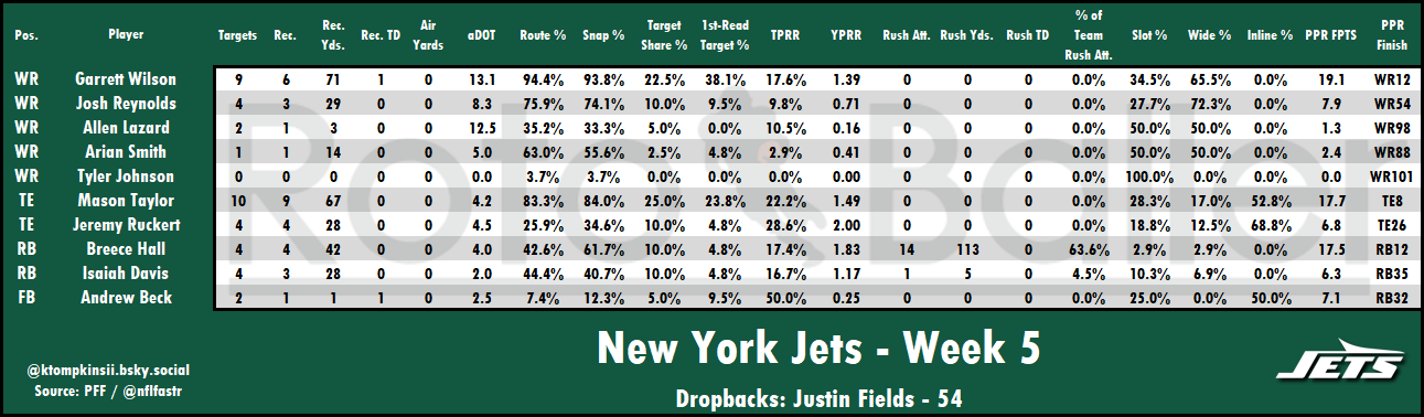 Not much truly matters in the passing game besides Garrett Wilson (6-71-1), who continues to crush almost every week, no matter who the quarterback is. The Jets and Justin Fields had a Week 5-high 54 dropbacks, but targets were pretty spread out aside from Wilson and tight end Mason Taylor.