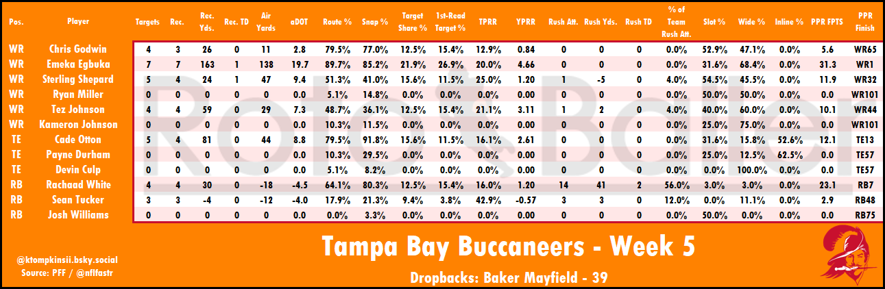 Outside of Egbuka’s awesome game, Cade Otton (4-81), Sterling Shepard (4-24-1), Tez Johnson (4-59), and Chris Godwin (3-26) spread out the passing volume with nobody really standing out.
