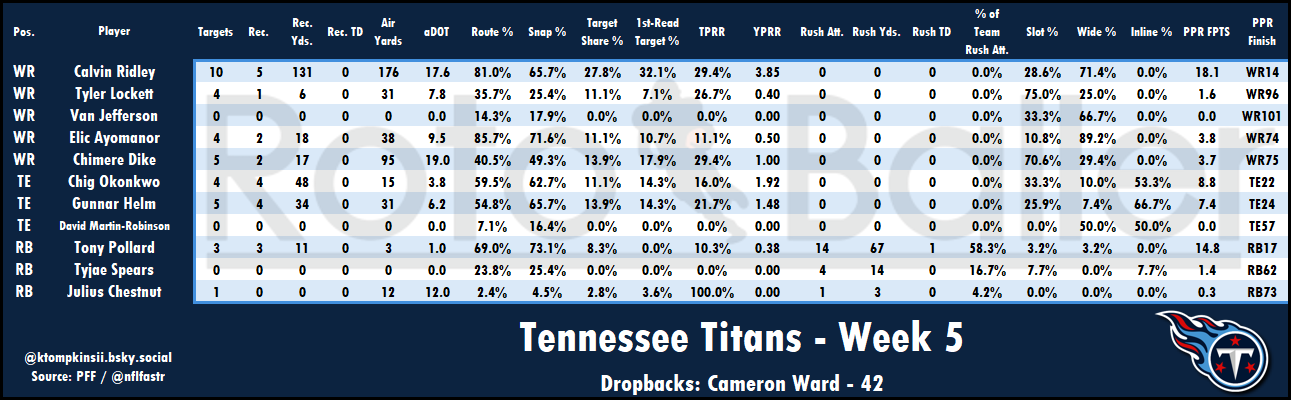 We had Calvin Ridley (5-131) lead the team with 10 targets and also lead the Week 5 pass-catchers in air yards (176) as Cameron Ward was just playing “huck it, chuck it” football with 42 dropbacks. Thankfully, the Titans have decreased Tyler Lockett’s (1-6) time on the field to a season-low 36 percent of routes per dropback, so they’re at least starting to get it a little bit.
