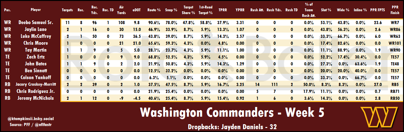 No other Commander had more than two targets or two receptions, but Deebo Samuel Sr., who paced the team with 11 targets and an 8-96-1 line, caught Daniels’ only touchdown. With Terry McLaurin still on the shelf for the Commanders, Samuel has filled in seamlessly as the top target his McLaurin’s absence. He was the clear focal point in the passing game, and with a bunch of bit part players around him, it only highlights what Samuel has done so far as a clear mid-round steal in fantasy drafts.