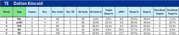 Kincaid’s fantasy value is tough, because while he does feel like a start at a thin position, the routes per dropback hovering around 60 percent really make it difficult to find the consistency and upside to rise above that baseline in a good week. Add in the personnel being very spread out with Dawson Knox and Jackson Hawes getting on the field a ton, plus the other wide receivers commanding spread-out target volume, and you’ve got a perplexing situation.