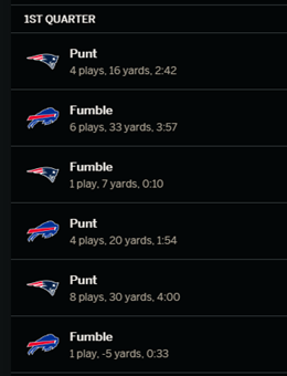 Both Josh Allen and Keon Coleman fumbled in the first quarter, and when added to the Rhamondre Stevenson fumble, made for an incredibly sloppy first quarter. In fact, these were the opening six drives for both teams before a Patriots’ field goal (on four plays for -1 yard) opened the scoring for the game.