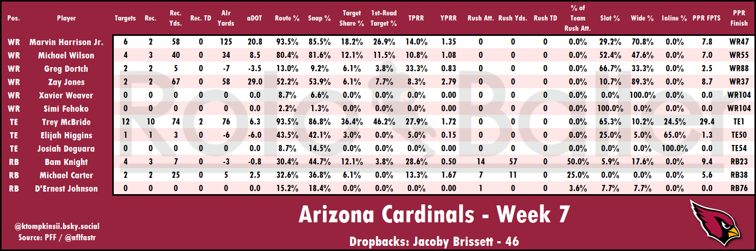 Marvin Harrison Jr. (2-58), Zay Jones (2-67), and Michael Wilson (3-40) also contributed, but were ultimately bit players compared to McBride’s dominance.