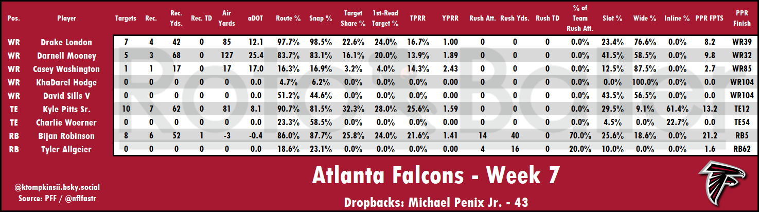 A bit of a disappointing game from Drake London (4-42), who earned seven targets but couldn’t get much going with so much defensive attention. 127 air yards for Darnell Mooney (3-68) that translated into 68 yards. Kyle Pitts Sr. led the Falcons with 10 targets and a solid 7-62 line, which could have added another 27 yards had a lineman not picked up a holding penalty. All three ran routes on at least 84 percent of routes per dropback, keeping up the condensed personnel the Falcons are famous for under offensive coordinator Zac Robinson.