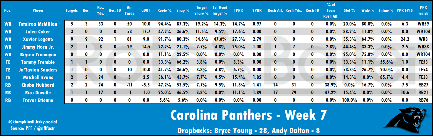 After a dud game against the Panthers in Week 6, Javonte Williams followed that up with 118 yards from scrimmage, a touchdown, and +36 RYOE; the fourth-best RYOE mark of Week 7. His role is awesome; he bounced back from his only bad game of the season, and he’s been one of the biggest early-season fantasy winners. Jaydon Blue (7-29) got loose for a 14-yard run on his first carry, but five of his seven carries in the game came in the fourth quarter with under five minutes left.