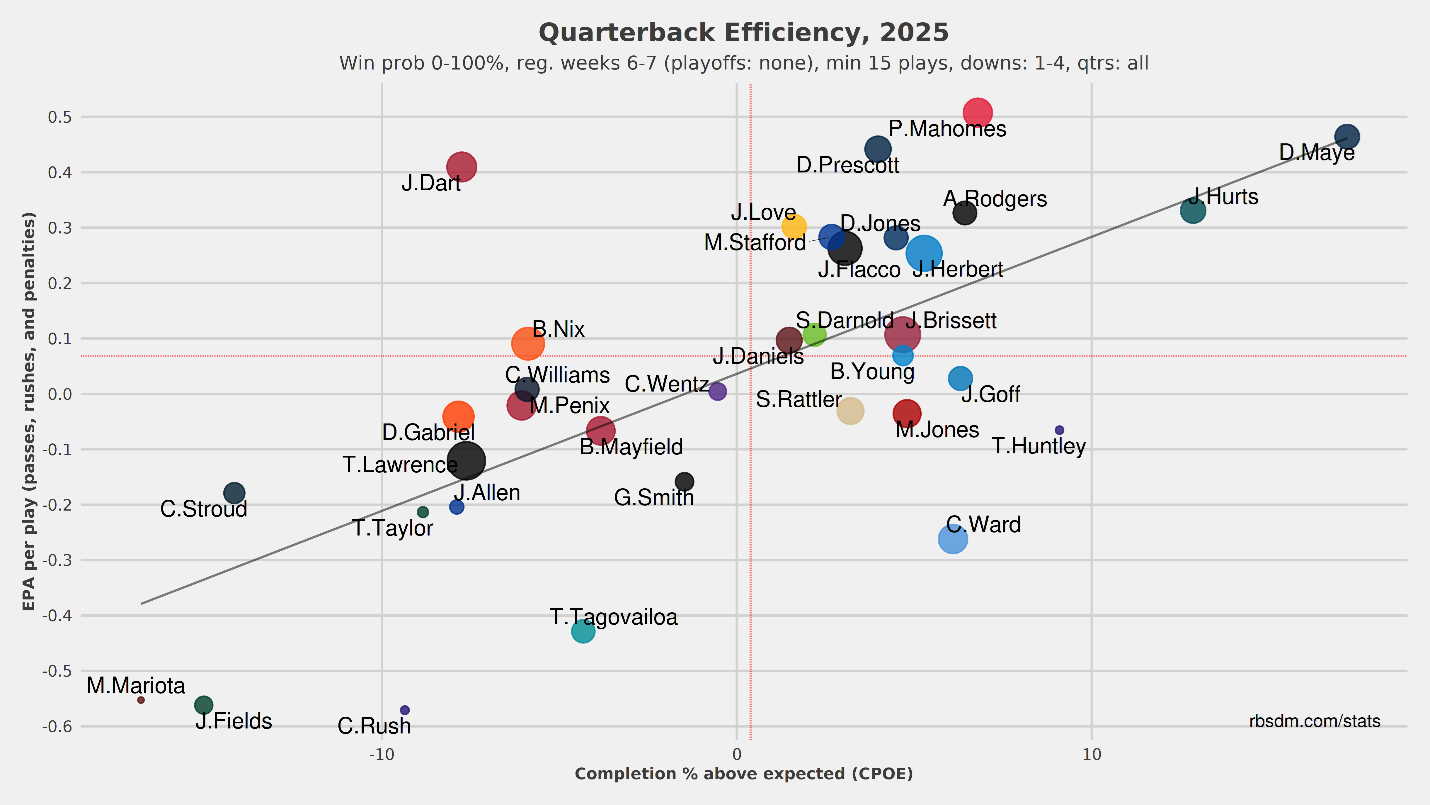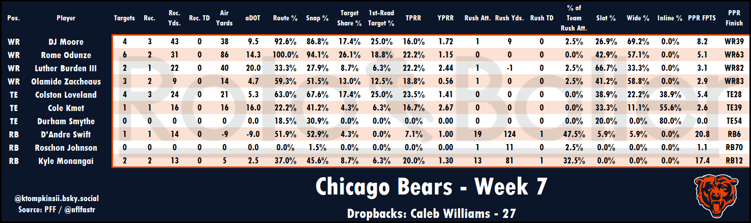 The Chicago Bears dominated this game by running the ball (-9.1 percent PROE – second-lowest mark of Week 7), and when you have the success you’re having with D'Andre Swift and Kyle Monangai as a backfield tandem, you’ve got to lean into it. Swift (19-124-1 rushing; 1-14 receiving) crushed for the second consecutive week and has come out of the bye firing on all cylinders.