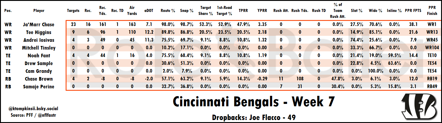 The offense is now functional in most weeks with Flacco at the controls in a way that could never be with Jake Browning. With defenses now having to account for a legitimate threat in Flacco that can get rid of the ball and get it to the guys who should be getting the ball, that allows a player like Chase Brown (11-108 rushing; 2-(-8) receiving, +66 RYOE) to succeed in spots where couldn’t before, having to deal with increased defenders in the box.