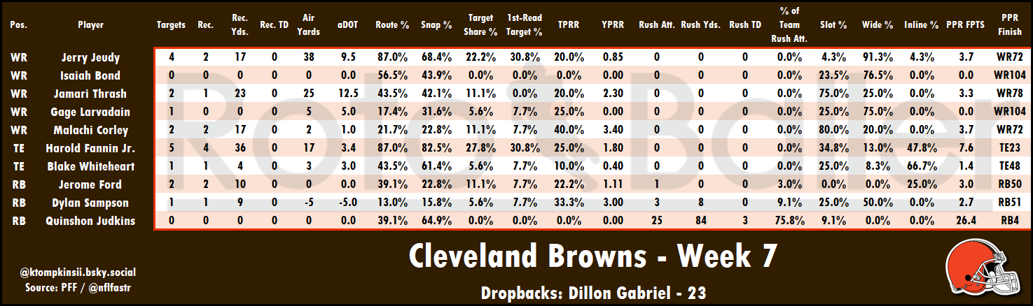 The passing game didn’t need much, but Harold Fannin Jr. (4-36, team-leading five targets) led everything with a meager line. Minus David Njoku, Fannin got to stretch his legs with a season-high 87 percent of routes as well. No other pass-catcher caught more than two balls, and only Jerry Jeudy (2-17) earned more than two targets.