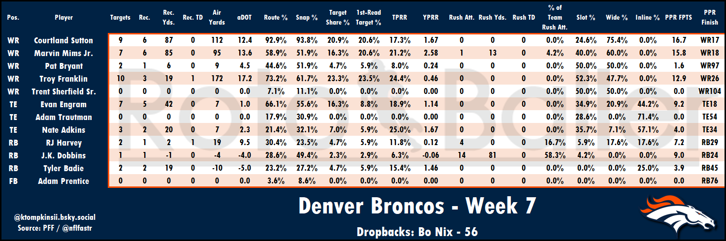 Outside of Franklin’s 10 targets, Sutton led the way with a 6-87 line on his typical 93 percent routes per dropback. Marvin Mims Jr. (6-85) took advantage of strong target volume and production on 59 percent of routes. In comeback mode, Evan Engram (5-42, seven targets) saw more routes than he typically does as he came up to a season-high 67 percent, well above his season average of 50 percent.