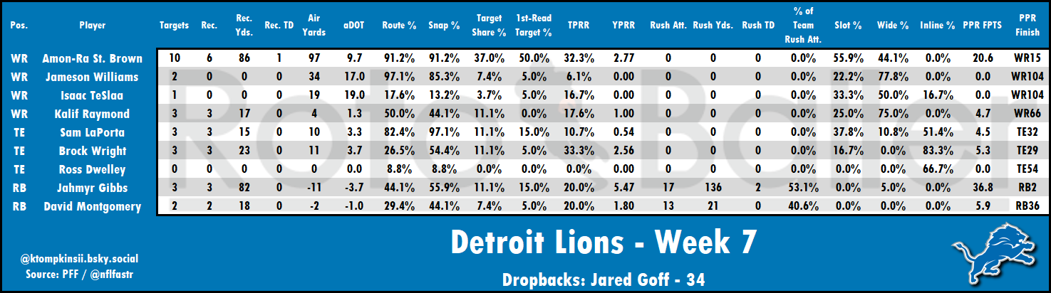 The passing game was not the focal point by any means, with Jared Goff’s 241 passing yards barely edging out Gibbs’ 222 yards from scrimmage. Amon-Ra St. Brown (6-86-1) is nearly automatic in this offense as the clear top target, and his 10 targets comfortably led the Lions’ pass-catchers. No other Lion had more than three targets or receptions. Of course, that previous sentence means underwhelming games from both Jameson Williams (two targets) and Sam LaPorta (3-15).