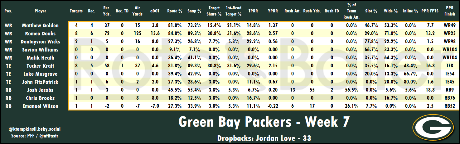 As for Kraft, he earned a career-high 10 targets and scored yet another touchdown. Quietly, Doubs and Kraft combined for over 60 percent of the team’s targets in Week 7. It’s probably time to toss Doubs in most fantasy lineups, but we HAVE seen this song and dance before with him.
