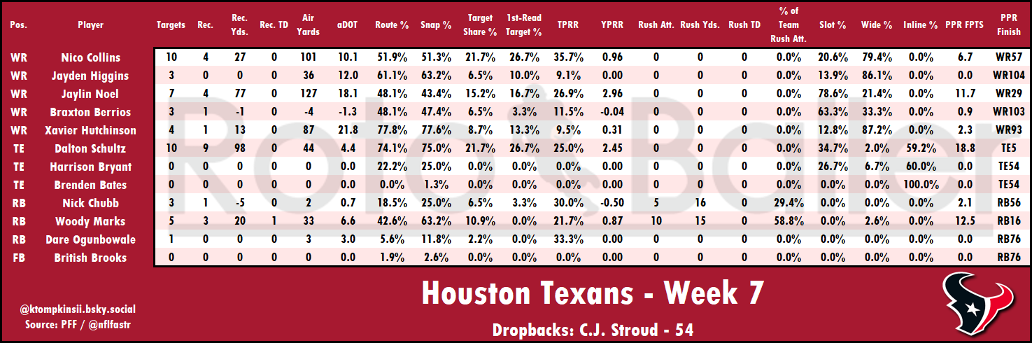 I guess we’re doing another week where we’re chastising the Houston Texans for not being smart or forward-thinking enough to get their Day 2 rookie wide receivers more work? Jaylin Noel showed a bit more of what he could do, as he paced the wide receivers with a 4-77 line on seven targets. That was on just 48 percent of routes, so that’s just dandy.