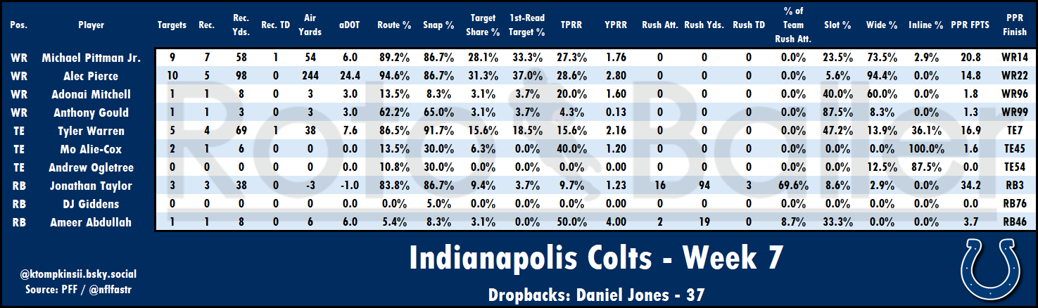 With Josh Downs inactive in Week 7, targets were primarily focused on Michael Pittman Jr., Alec Pierce, and Tyler Warren. Pittman (7-58-1) scored a fun four-yard touchdown where he was lined up in the back of trips formation, slot receiver Anthony Gould (1-3) goes in motion to the weak side, comes back in motion before the snap and after a play-fake to Taylor, Pittman runs along the back of the line post-snap to chip the defensive end and leak out for the easy touchdown. It was a super cool play design, and that’s why the Colts are so fun to watch every week.