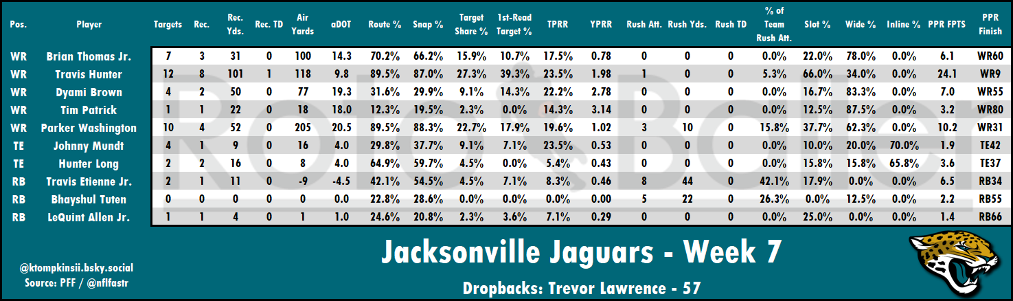 The Jaguars got down 21-0 heading into the fourth quarter and then still allowed 14 points in the final frame of the game. Their only score was a Travis Hunter garbage touchdown in the middle of the fourth quarter. Hunter (8-101-1, 90 percent of routes per dropback) also co-led the team in routes while playing a three-week low of 14 snaps on defense.