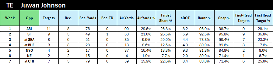 After starting the season on fire with three top-10 finishes to start the season, Johnson suffered an ankle injury in Week 4 but played through it for a few weeks. It clearly affected him as he put up three weeks with a combined nine targets, seven receptions, and 60 yards. Week 7 saw a return to form of sorts, where Johnson just missed being a fantasy top-12 tight end on the week, but still put up a 5-79 line on seven targets with his strong role.
