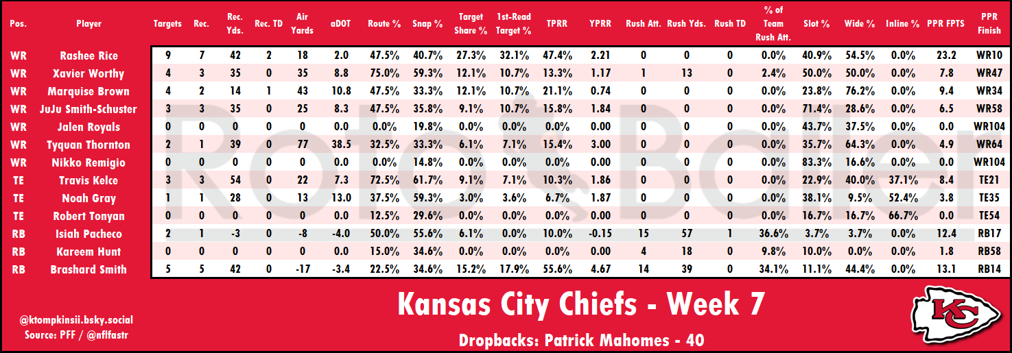 Rashee Rice (7-42-2) played his first game since his six-game suspension by the NFL, and he made his presence immediately felt with a team-high nine targets and two touchdowns. He ran just a 2.0-yard aDOT, which is totally fine and very normal for him. Welcome back, king!