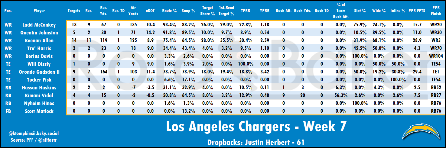 Keenan Allen (11-119-1, team-high 14 targets) and Ladd McConkey (9-67, 13 targets) combined for 27 targets in excellent games for each. Quentin Johnston (2-30-1) missed Week 6 but returned for Week 7 to score a touchdown and not much else.