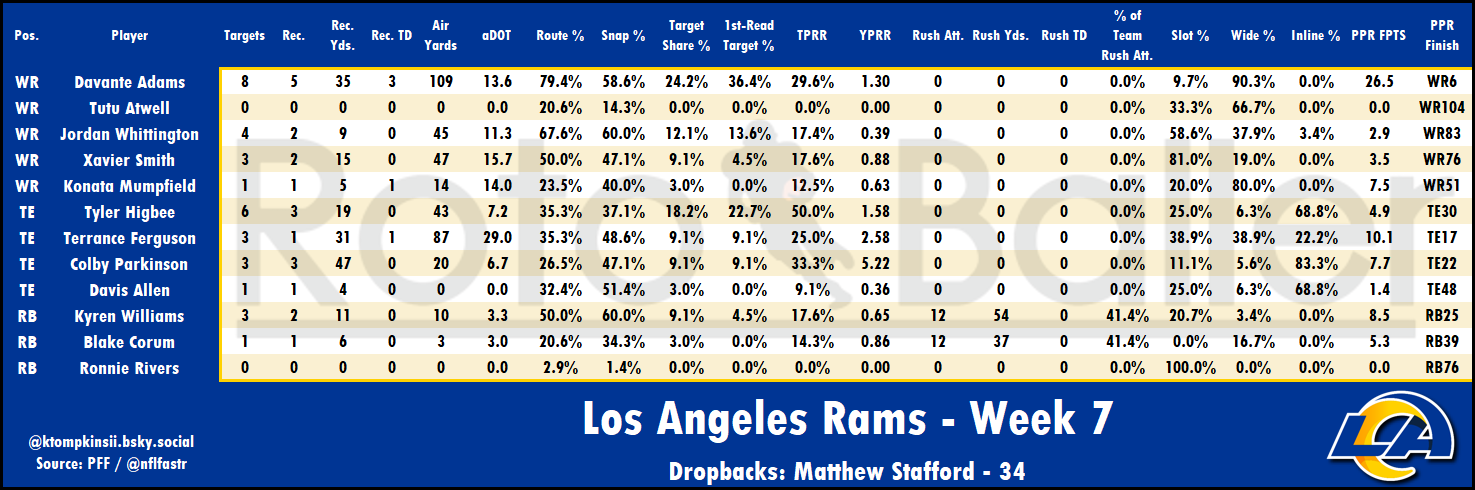 Playing the role of Sutton was Davante Adams (5-35-3), who led the Rams in routes and had a lackluster target-earning line but scored three touchdowns, so those sins can be forgiven. With no Nacua, Jordan Whittington (2-9) was his backup on the day and ran the second-most routes (68 percent) to meager results. If the game script were a little more conducive to passing the ball, I’m sure there would have been much more meat on the bone there.