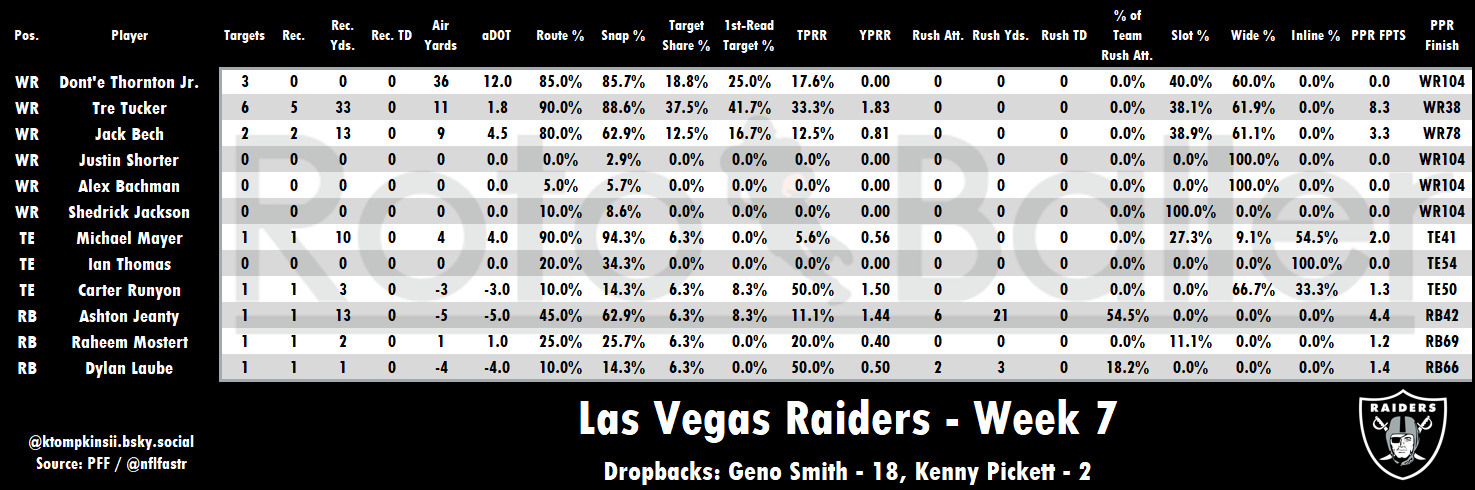 Only Tre Tucker (5-33) and Jack Bech (2-13) caught at least two passes from Geno Smith. Besides those two, only Dont'e Thornton Jr. (three targets, no receptions) earned more than one target.