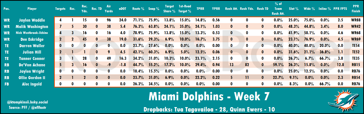Not as much of a factor in the passing game this week for Achane, but that’s due to the wind being a factor in how they could attack defenses with designed stuff short. On the ground, Achane was excellent given their offensive environment, but the Dolphins could truly use a Raheem Mostert-type running back for Achane to play off. If Ollie Gordon II (5-11 rushing; 1-2 receiving) was going to be in that role, I feel like Gordon would be featured much more to this point. Jaylen Wright was active for the first time this season but didn’t earn a touch.