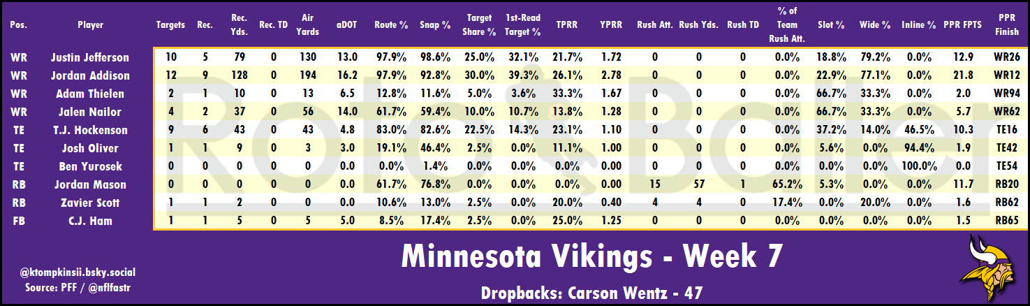 Wentz directed 31-of-40 targets to Justin Jefferson, Jordan Addison, and T.J. Hockenson on the afternoon, with only Jalen Nailor (2-37) and Adam Thielen (1-10) being the only other receivers to earn more than one target.