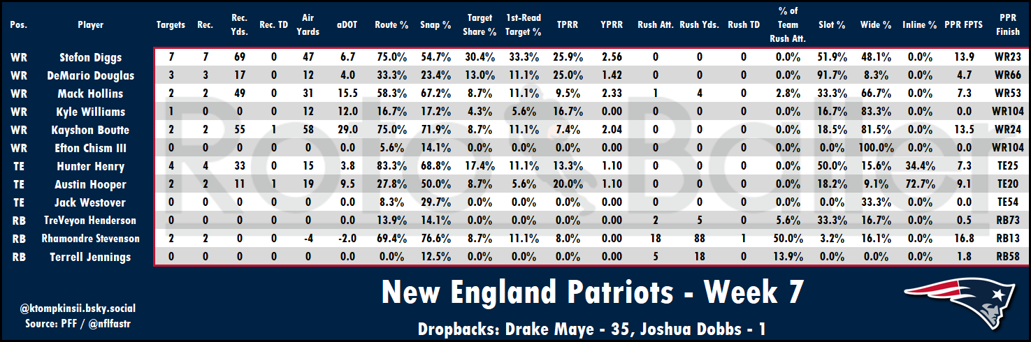 Somehow, and bewilderingly, the split between Rhamondre Stevenson and TreVeyon Henderson got even wider. Stevenson (18-88-1 rushing; 2-0 receiving) saw a season-high 77 percent of snaps and 69 percent of routes, while Henderson (2-5) earned just two touches on the afternoon. It’s not as though this was a neutral script game throughout, either. We were at the 31-13 final score midway through the third quarter after the Patriots’ defense recovered a fumble for a score.