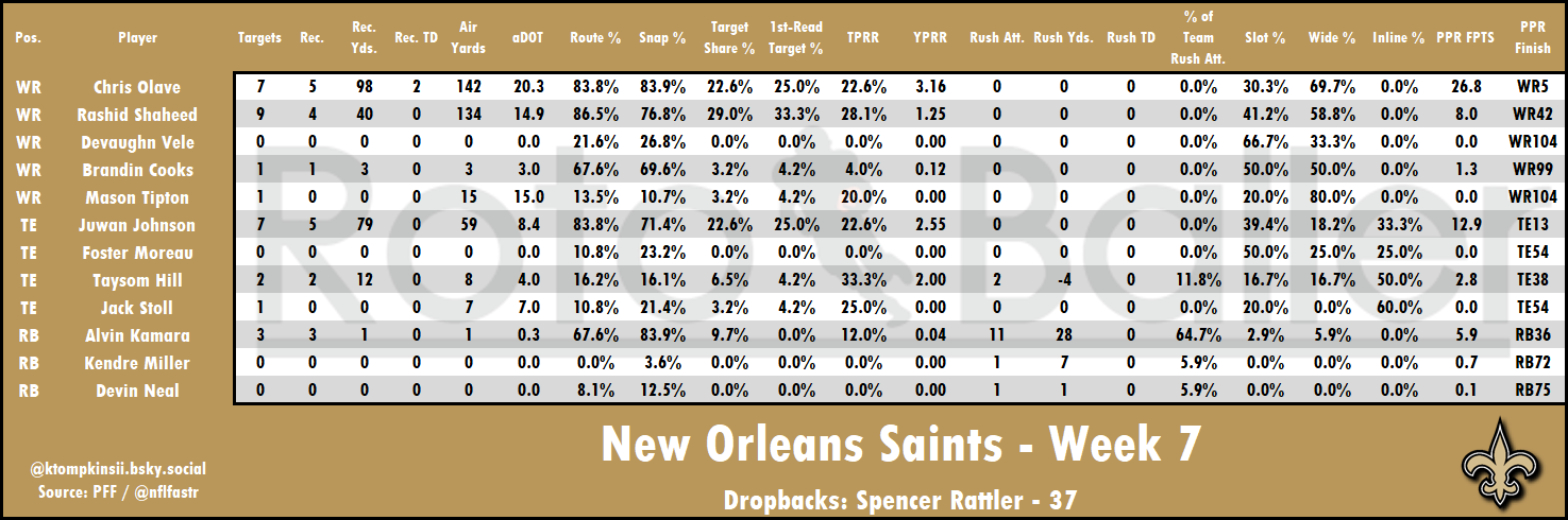 Spencer Rattler threw three interceptions and fumbled for four total turnovers as the Bears just ran up and down on the Saints. The passing game was condensed with Chris Olave, Rashid Shaheed, and Juwan Johnson combining for almost 75 percent of the team’s total targets. Olave (5-98-2) was very good with a couple of scores, plus a 57-yard pass play close to halftime. Shaheed (4-40) led the team with nine targets, and we got a return to form for Juwan Johnson.