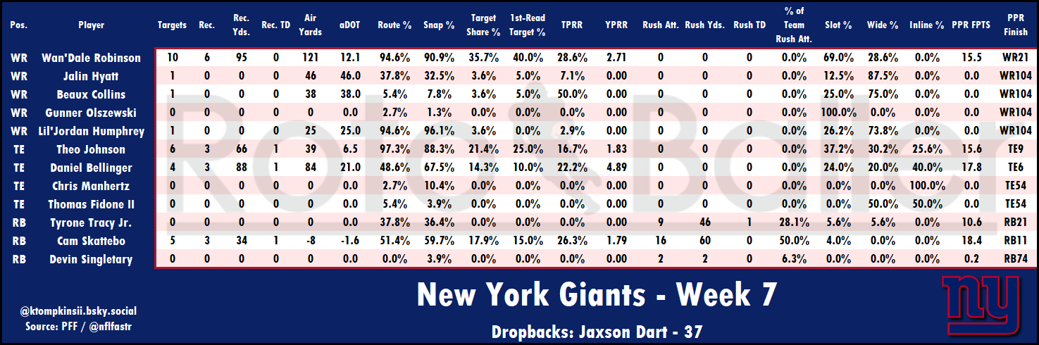 Tyrone Tracy Jr. was involved in the run game and broke a 31-yard touchdown late in the third quarter. Tracy (9-46-1 rushing) still isn’t a fantasy-relevant back, but he is still used a bit and at least showed a sign of life.
