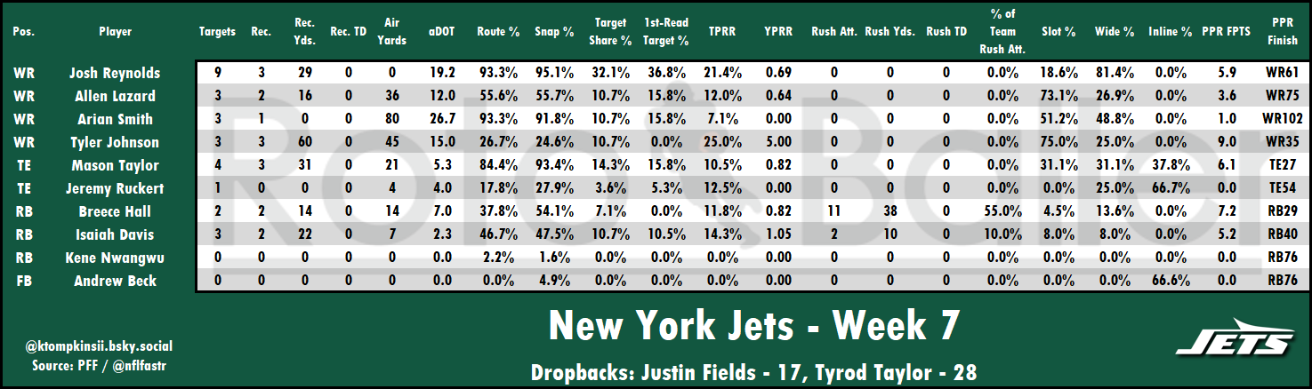 No Garrett Wilson, but nobody on this team had more than three receptions. Josh Reynolds (3-29) led the team with nine targets and ran a ton of routes. This is the worst receiving group that I can remember. It’s bad. Oh, Tyler Johnson (3-60) led the Jets with 60 yards in a game which Justin Fields was pulled from the game for Tyrod Taylor.