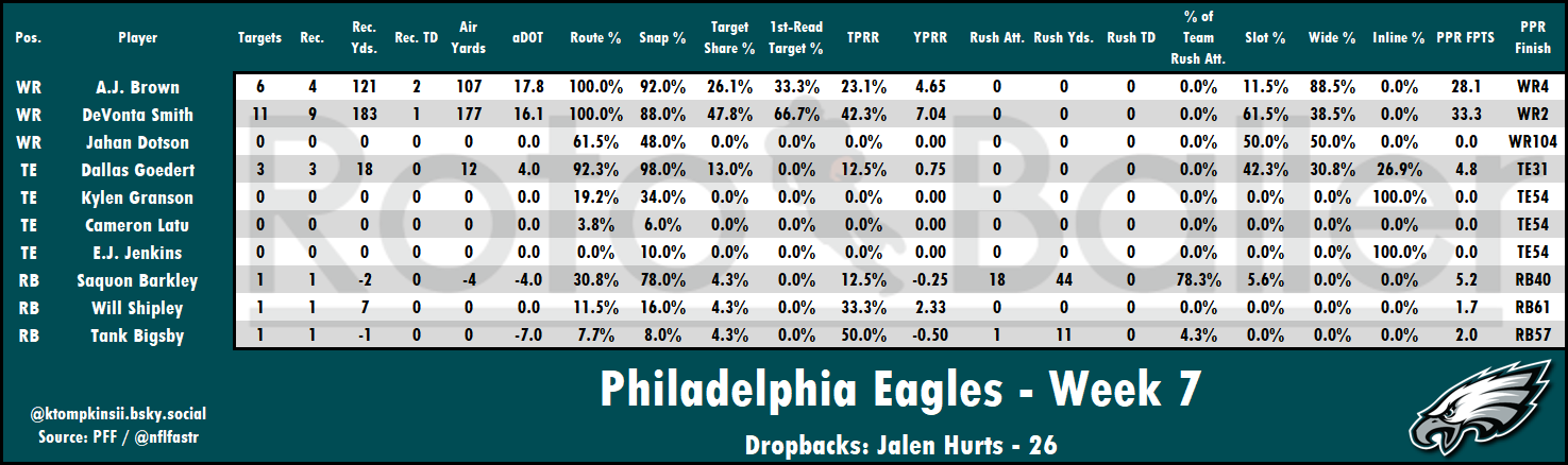 Brown (4-121-2) and Smith (9-183-1) combined for 304 of Hurts’ 326 passing yards, with Dallas Goedert (3-18) adding 18 yards of that 326-yard total. It’s the most clear and concise way of explaining a condensed offense as the trio of Brown, Smith, and Goedert combined for 20-of-23 targets and all but FOUR receiving yards on the afternoon.