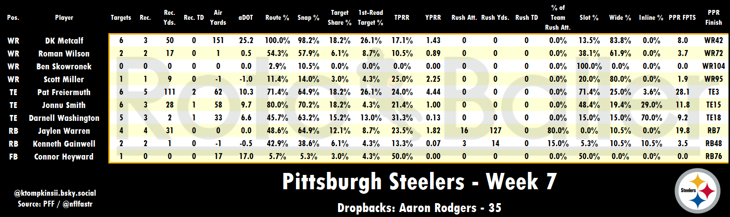 Putting a huge gap between himself and Kenneth Gainwell is Jaylen Warren, who was incredibly efficient and, with his play, relegated Gainwell to mostly pass-blocking duty. Warren put up 158 yards from scrimmage and put to bed any workload split between the two backs. Kaleb Johnson didn’t play a snap. If you haven’t dropped him, go ahead and do so.