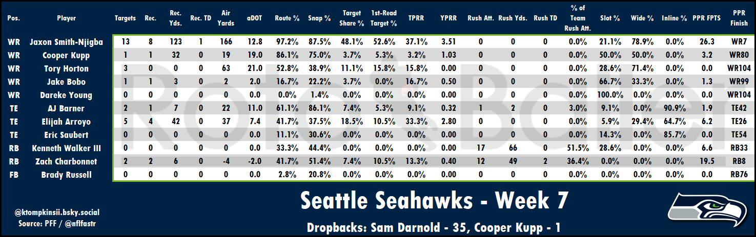 Who else, but Jaxon Smith-Njigba? At this point, you yawn at *just* an 8-123-1 line on almost half of Seattle’s targets. He’s automatic and inevitable at this point as what will almost assuredly be a 2026 top-6 overall fantasy pick. He must be, right? Cooper Kupp (1-32; passing INT) was slightly involved at 86 percent of routes. Only Elijah Arroyo (4-42) caught more than one pass amongst the wide receivers and tight ends.