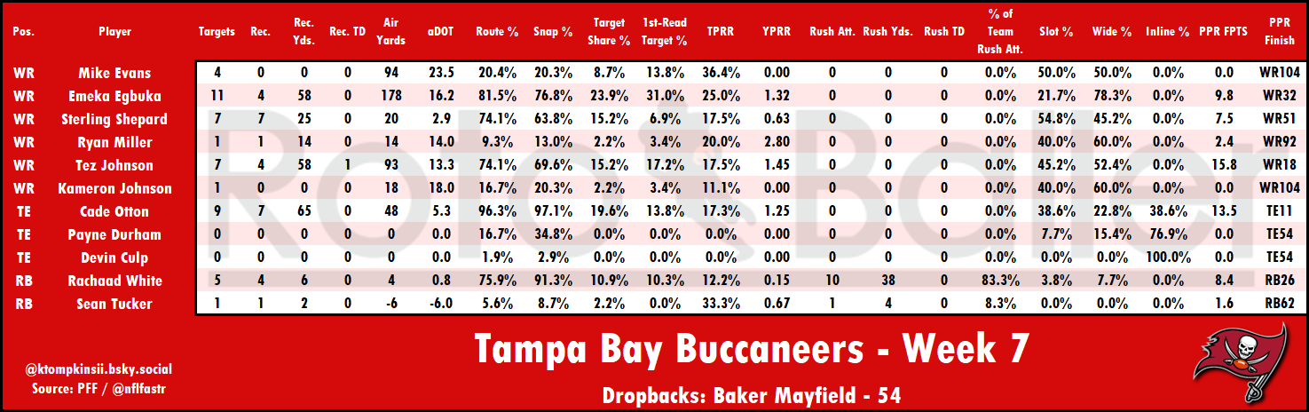 Emeka Egbuka (4-58) played 82 percent of routes per dropback after being a game-time decision due to a hamstring injury. Egbuka was inefficient, catching just four of his team-leading 11 targets. Tez Johnson (4-58-1) has been a real shot in the arm for the Tampa pass-catching group over the last few weeks, as all he’s done in his limited time on the field is produce. Cade Otton (7-65) ran a ton of routes and, with multiple Buccaneers injured, put up a solid effort in the defeat.