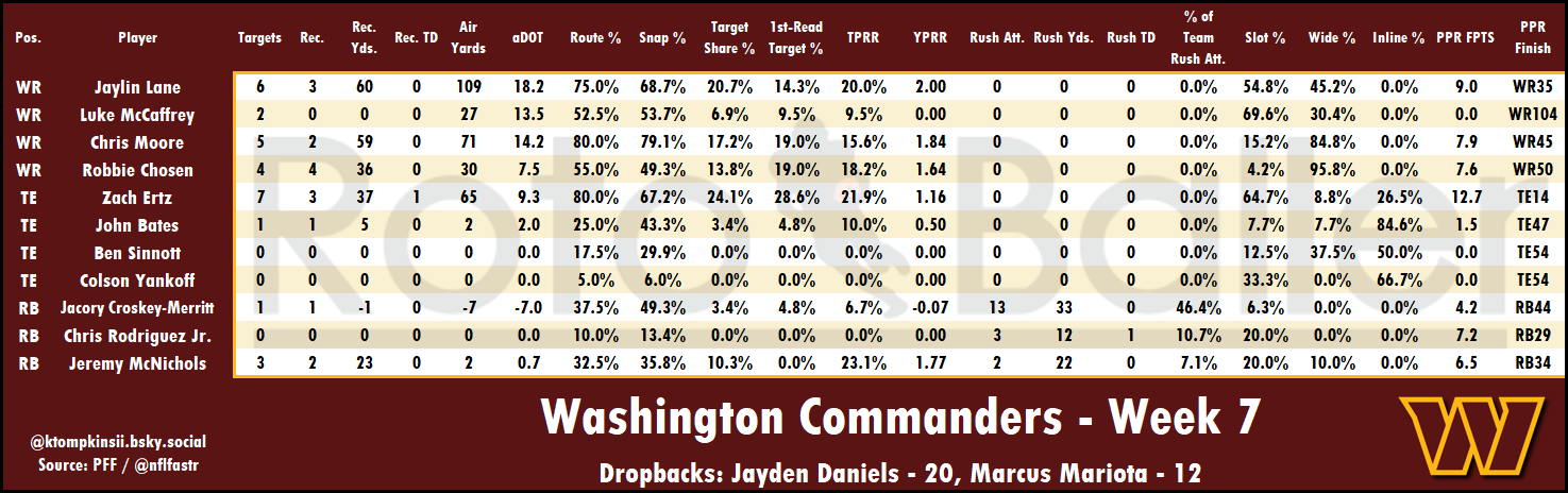 Zach Ertz (3-37-1) led the team with seven targets and scored their only receiving touchdown. Chris Moore (2-59) ran 80 percent of routes per dropback, but he shouldn’t be more than a bit player at his advanced age of 32. Jaylin Lane (3-60) ran 75 percent of routes as well and led the Commanders with 60 receiving yards on three catches. The team had to take Robbie Chosen (4-36) out of mothballs to be able to field a group of pass-catchers. That’s where we’re at here with this team.