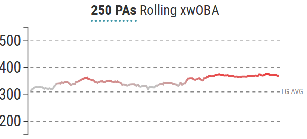 On Friday, Lewis went 3-for-3 with a walk and a double. That sort of performance was coming. The reason I say that is if we look at Lewis' rolling Hard-Hit% and fly ball rate (FB%), things have been trending in the right direction.