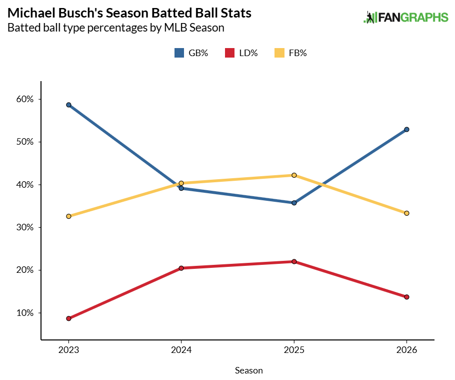 That's not to say Busch can't turn things around. In 2025, his 22.0% LD% ranked 27th among the 145 qualified hitters. Only 25 of those qualified hitters had a lower ground ball rate than Busch. This year, among the 189 qualified hitters, Busch has the 18th highest ground ball rate and 28th lowest line drive rate.
