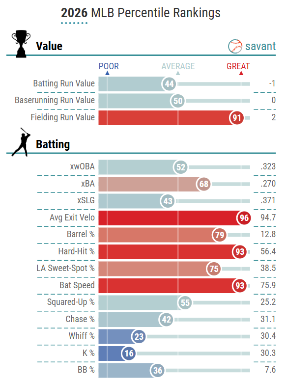 Maybe not nothing. But one RBI and six runs from someone with a .270 batting average doesn't seem right. And for someone with such power potential, the lack of home runs is a disappointment. There's no way someone with such high levels of quality contact won't start clearing the fences soon.