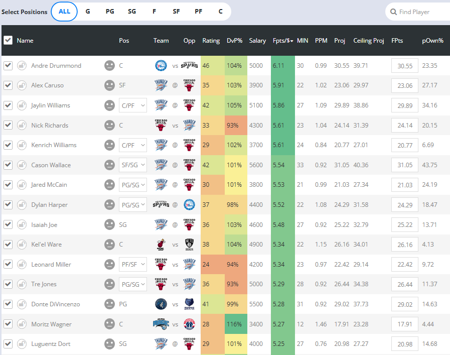 A quick examination of our RotoBaller projections for tonight's slate shows that the Thunder-Bulls game presents us with some of the best value on the slate. OKC is a 10-point favorite, but will be without four of its regular rotational players, including Shai Gilgeous-Alexander.