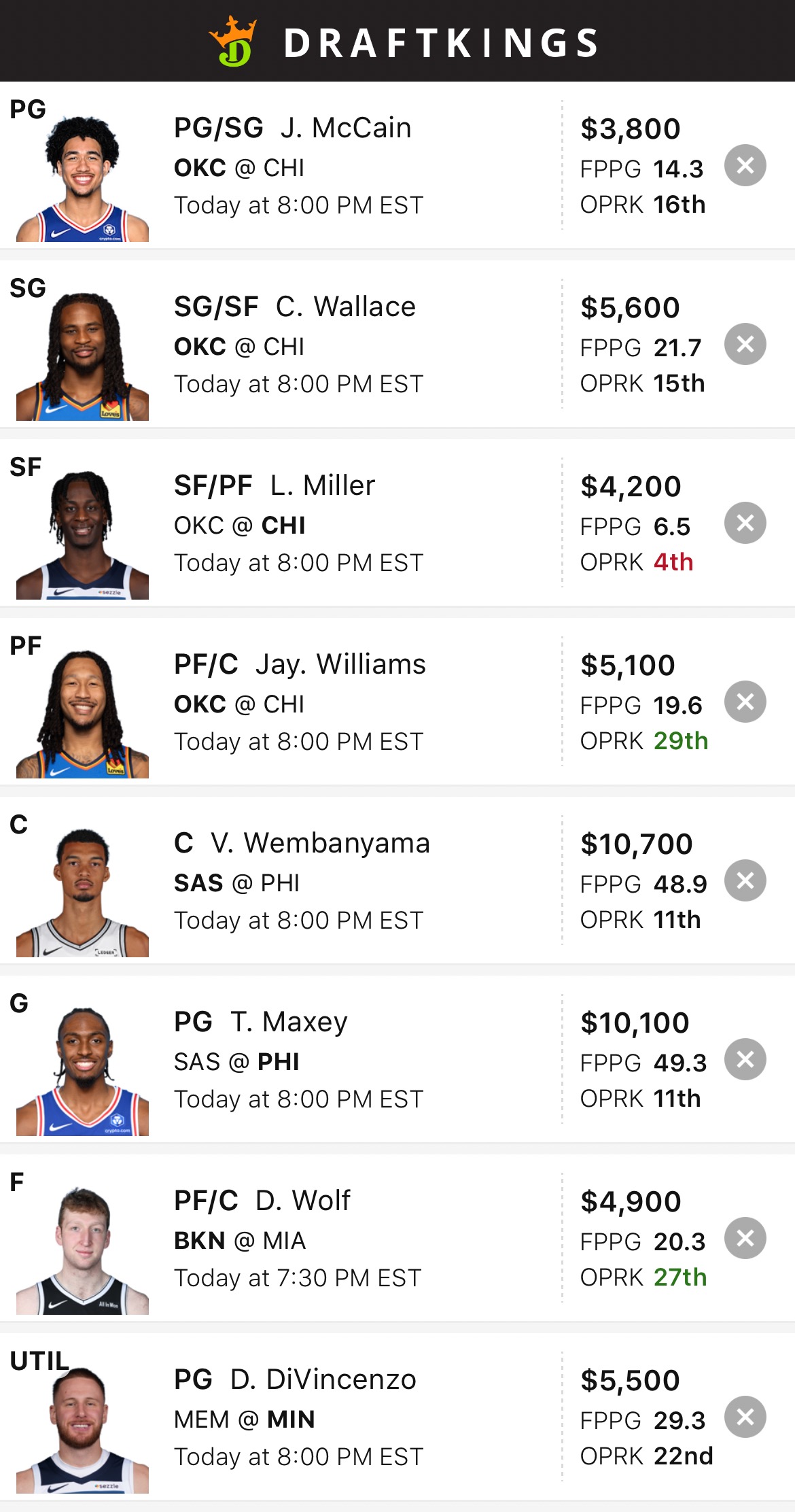 Sample DraftKings Lineup