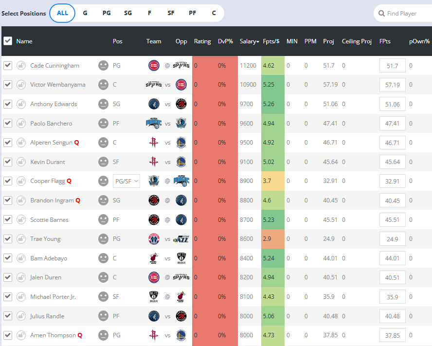 Let's take a quick peek at our RotoBaller projections for tonight's slate with all players that are $8k or higher. Wemby, Cunningham, and Duren are all firmly in play in this premier Detroit-San Antonio matchup, while Anthony Edwards and Scottie Barnes are also spend-up options in the Minnesota-Toronto game.